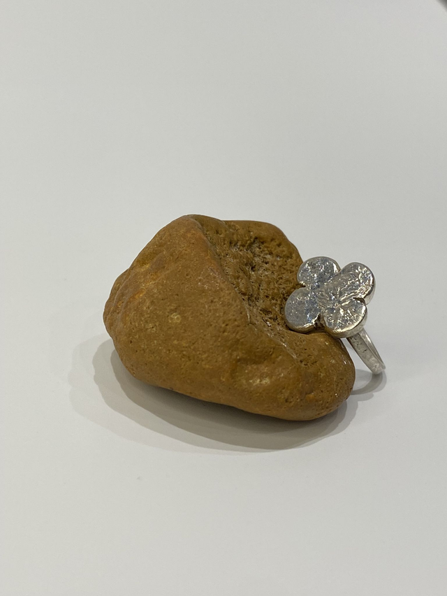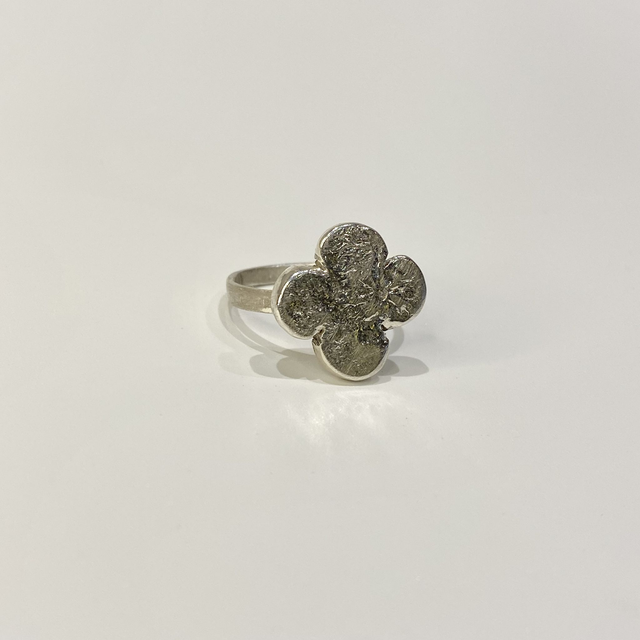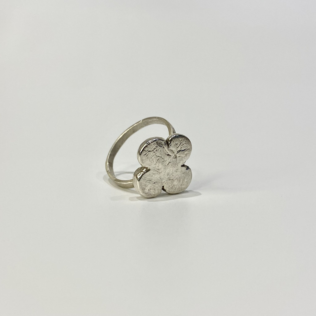 Bague sculptée autour d’un trèfle à quatre feuilles, façonné en argent massif par un travail de réticulation au feu.
