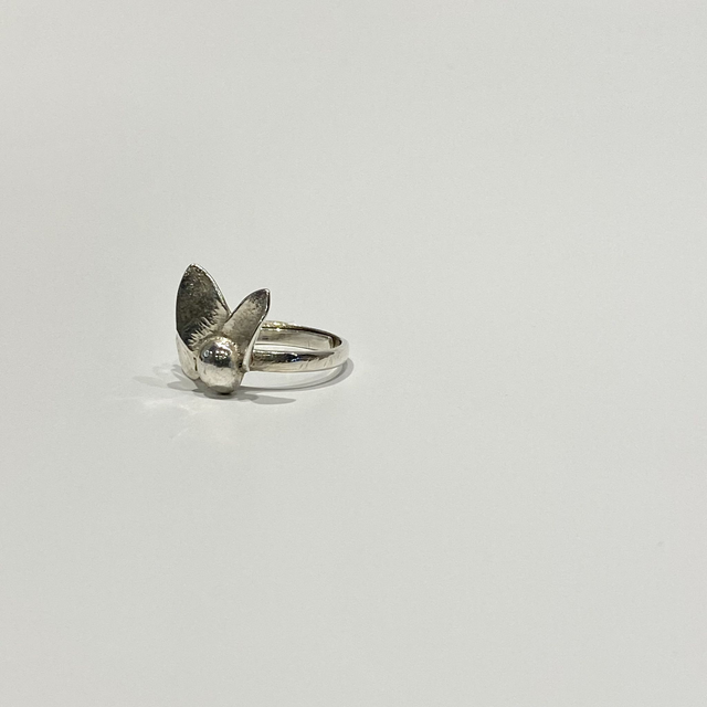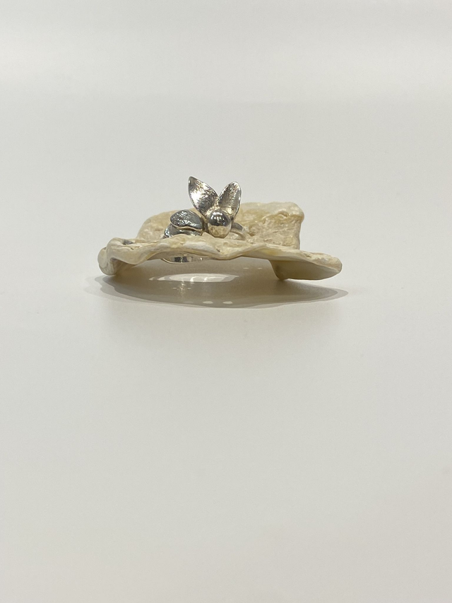 Deux pétales reposent délicatement sur une perle en argent, tandis que les deux autres s’intègrent naturellement au corps de la bague. Cette composition asymétrique apporte mouvement et modernité, tout en conservant une douceur florale affirmée.