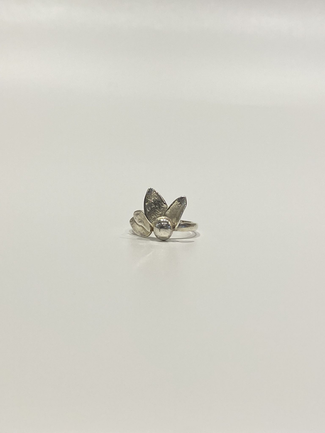 Quatre pétales en forme s’épanouissent sur un seul côté de l’anneau, créant un équilibre subtil entre légèreté et présence.