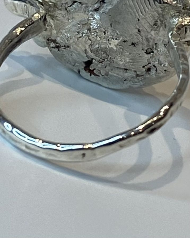 Le corps de la bague, martelé à la main, capte la lumière avec douceur et profondeur.